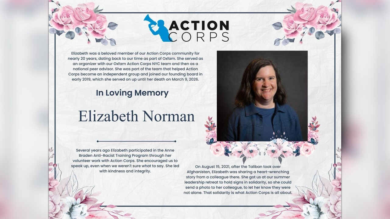 Please join us in honoring Elizabeth Lacy Norman, a beloved member of the Action Corps community for nearly 20 years, dating back to our time as part of Oxfam. She served as an organizer with our Oxfam Action Corps NYC team and later as a national peer advisor, leading with kindness and integrity. Elizabeth was part of the team that helped Action Corps become an independent organization and joined our founding board in early 2019, where she served until her passing on March 9, 2026.