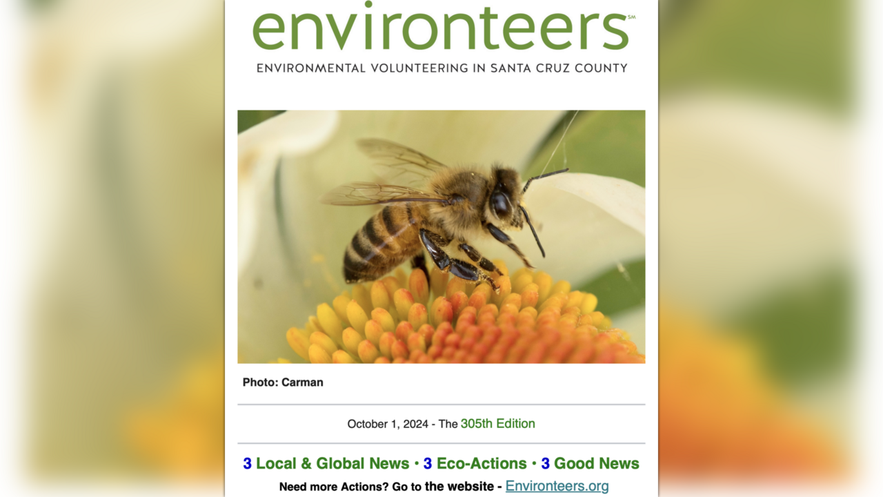 EnvironteersWe created Environteers in 2016 to make it easy to keep informed and in action protecting & restoring our environment. The website and Weekly Update newsletter publicize the educational and volunteer activities of all Santa Cruz County environmental groups as well as those of state and national organizations.