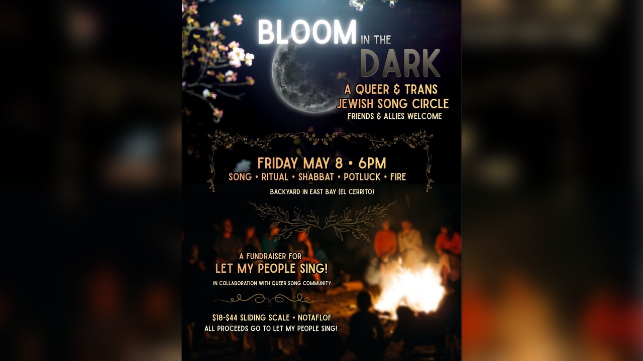 Join us for Bloom in the Dark, a queer/trans Jewish shabbat and song circle, that is a fundraiser for Let My People Sing! in collaboration with Queer Song Community. This event is open to non jewish folks and straight allies. Come eat and sing with us around a backyard fire! We (Ele, Leo, Tal and Ziv) look forward to holding a song and ritual space that will include some pre and post socializing. We hold the question, will there still be blooming in these dark times?